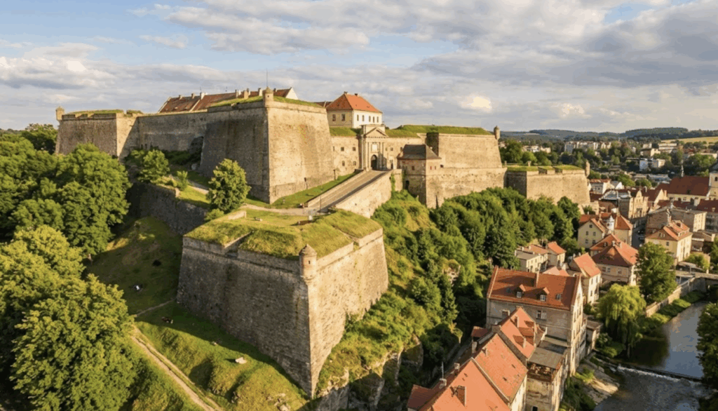 What Makes It Special: The massive 18th-century fortress, with its underground passages and bastions, dominates the town. Below, the Gothic bridge with baroque statues (a miniature version of Prague’s Charles Bridge) and the medieval town centre create an atmospheric setting.